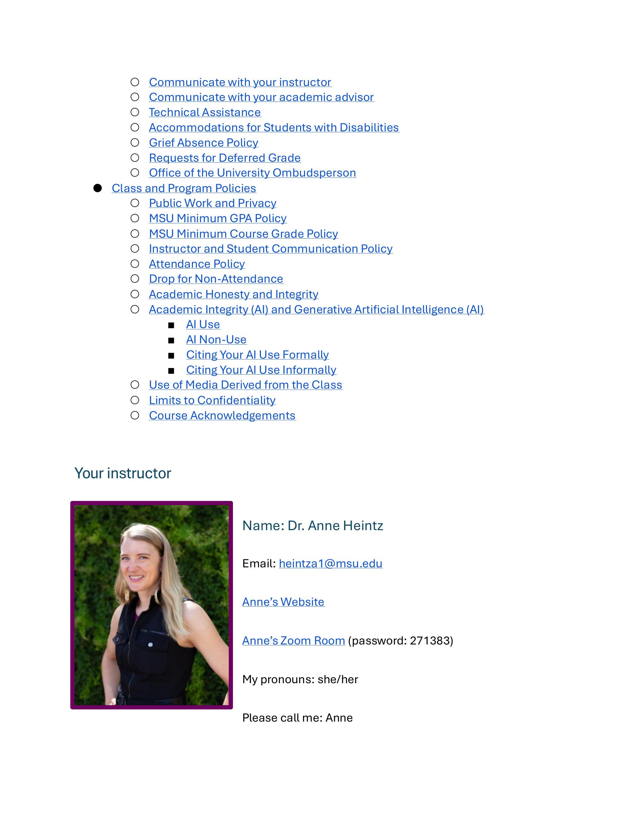 - MSU Minimum GPA Policy $\bigcirc$ MSU Minimum Course Grade Policy $\bigcirc$ Instructor and Student Communication Policy $\bigcirc$ Attendance Policy $\bigcirc$ Drop for Non-Attendance $\bigcirc$ Academic Honesty and Integrity $\bigcirc$ Academic Integrity (AI) and Generative Artificial Intelligence (AI)