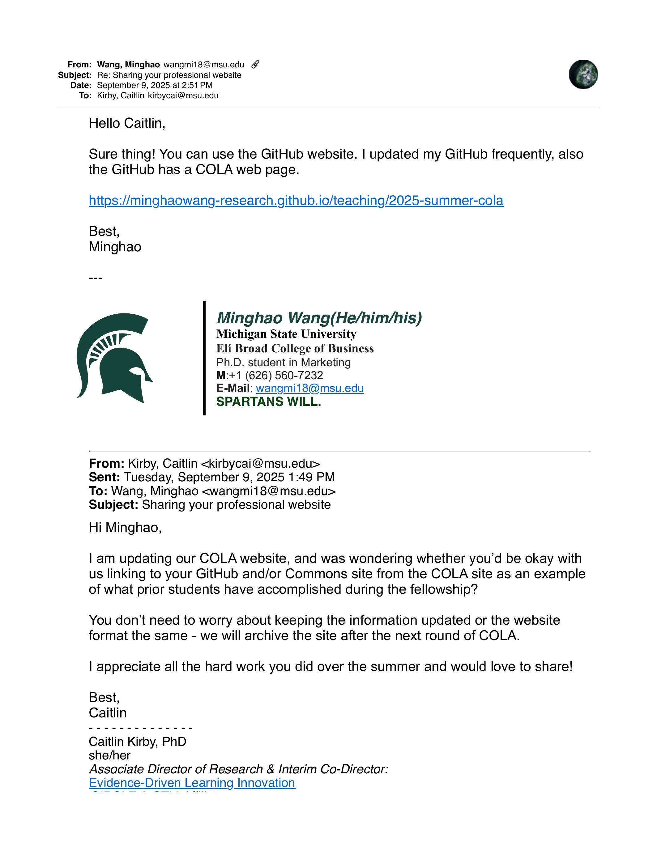From: Kirby, Caitlin kirbycai@msu.edu Sent: Tuesday, September 9, 2025 1:49 PM To: Wang, Minghao wangmi18@msu.edu Subject: Sharing your professional website Hi Minghao, I am updating our COLA website, and was wondering whether you’d be okay with us linking to your GitHub and/or Commons site from the COLA site as an example of what prior students have accomplished during the fellowship?